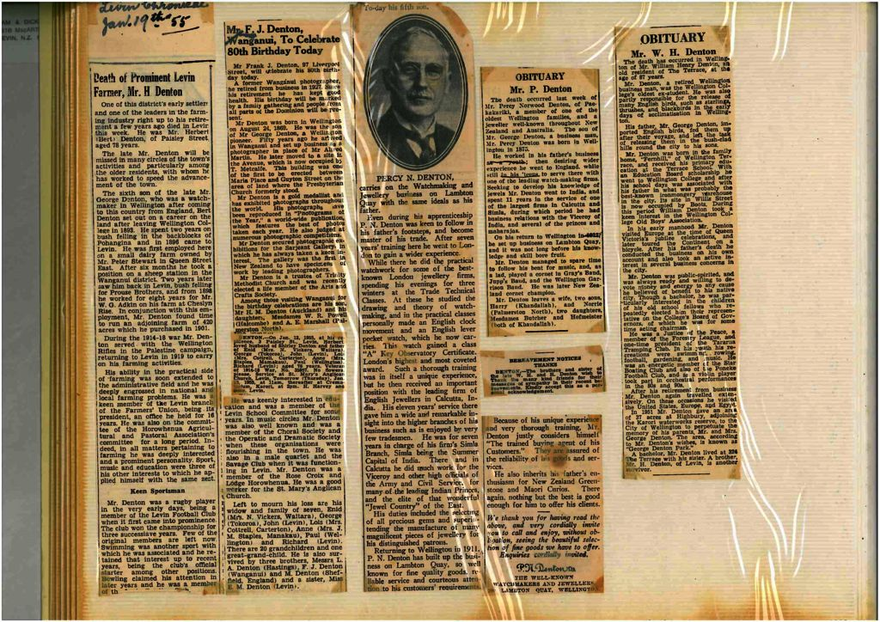 The death occurred last week of Mr. Percy Norwood Denton, of Paekakariki, a member of one of the oldest Wellington families, and a jeweller well-known throughout New Zealand and Australia. The son of Mr. George Denton, a business man, Mr. Percy Denton was born in Wellington in 1875.