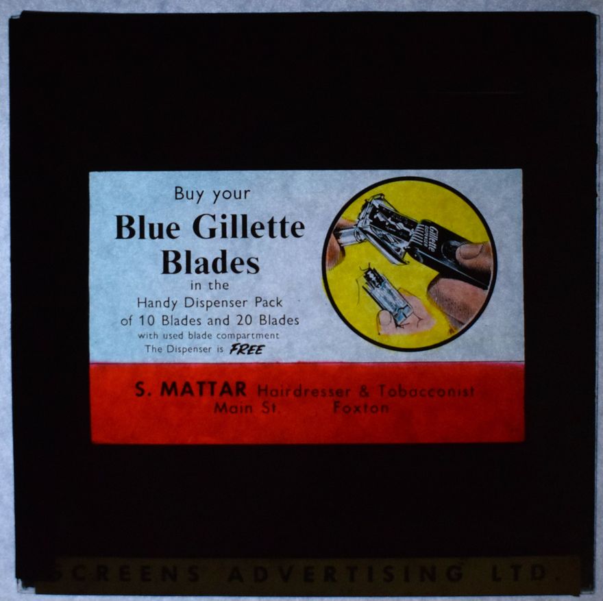 This is one of multiple slides from this business searchable on Kete. This one advertises Gillette razors. The 'Blue Blade' razor was introduced in the early 1930s- however this slide looks to be a lot later than this. The date is only a vague estimation on this one!