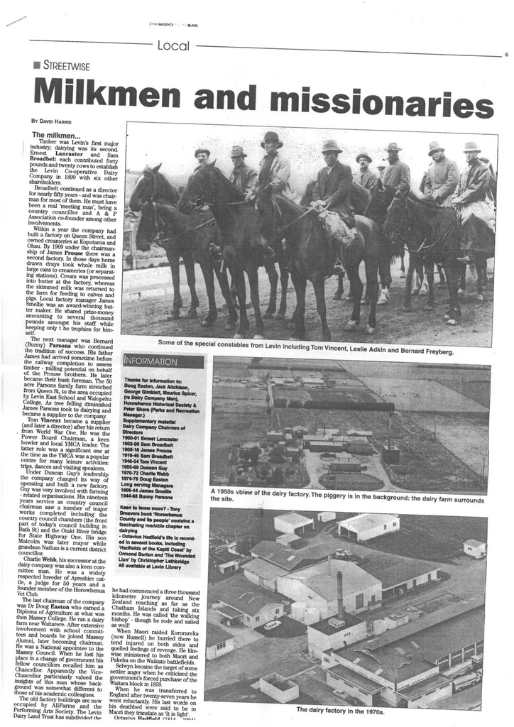 Within a year the company had built a factory on Queen Street, and owned creameries at Koputaroa and Ohau. By 1909 under the chairman-ship of James Prouse there was a second factory . In those days horse drawn drays took whole milk in large cans to creameries (or separating stations). Cream was processed into butter at the factory whereas the skimmed milk was returned to the farm for feeding to calves and pigs. Local factory manager James Smellie was an award-winning butter maker. He shared prize-money amounting to several thousand pounds amongst his staff while keeping only the trophies for himself. The next manager was Bernard (Bunny) Parsons who continued the tradition of success. His father James had arrived sometime before the railway completion to assess timber - milling potential on behalf of the Prouse brothers. He later became their bush foreman. The 50 acre Parsons family farm stretched from Queen St, to the area occupied by Levin East School and Waiopehu College. As tree felling diminished James Parsons took to dairying and became a supplier to the company. Tom Vincent became a supplier (and later a director) after his return from World War One. He was the Power Board Chairman, a keen bowler and local YMCA leader. The latter role was a significant one at the time as the YMCA was a popular centre for many leisure activities: trips, dances and visiting speakers. Under Duncan Guy's leadership the company changed its way of operating and built a new factory. Guy was very involved with fanning - related organisations. His nineteen years service as country council chairman saw a number of major works completed including the country council chambers (the front part of today's council building in Bath St) and the Otaki River bridge for State Highway One. His son Malcolm was later mayor while grandson Nathan is a current district councillor. Charlie Webb, his successor at the dairy company was also a keen committee man. He was a widely respected breeder of Ayreshire cattle, a judge for 50 years and a founder member of the Horowhenua Vet Club. The last chairman of the company was Dr Doug Easton who earned a Diploma of Agriculture at what was then Massey College. He ran a dairy farm near Waitarere. After extensive involvement with school committees and boards he joined Massey Alumni, later becoming chairman. He was a National appointee to the Massey Council. When he lost his place in a change of government his fellow councillors recalled him as Chancellor. Apparently the Vice-Chancellor particularly valued the insights of this man whose back-ground was somewhat different to those of his academic colleagues. The old factory buildings are now occupied by AllFarms and the Performing Arts Society. The Levin Dairy Land Trust has subdivided the involvement with school committees and boards he joined Massey Alumni, later becoming chairman. He was a National appointee to the Massey Council. When he lost his place in a. change of government his fellow councillors recalled him as Chancellor. Apparently the Vice Chancellor particularly valued the insights of this man whose back-ground was somewhat different to those of his academic colleagues. The old factory buildings are now occupied by AllFarms and the Performing Arts Society The Levin Dairy Land Trust has subdivided the adjoining land for the polytech and residential sections - there being less than ten left for sale. , One exciting prospect for the area is the public reserve which will have access from Vincent Drive, Martin Harvey St, and Easton Way. This 1.6 hectare site - about the equivalent of three rugby fields will be a welcome oasis of green. The first stage of development will begin in early 2001 after which we will be asked for our ideas. Be ready! Apart from those mentioned already, other nearby streets honour men who were directors of the dairy company at the time of the factory closure - Charlie Wright, Alan Lynch, Jack Aitchison and George Gimblett.