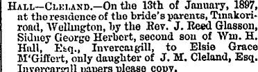 Hall— Cleland — On the 13th of January, 1897, at the residence of tho bride's parents, Tinakori road, Wellington, by the Rev. J. Reed Glasson, Sidney George Herbert, second sou of Wm. H. Hall, Esq., Invercargill, to Elsie Grace M'Giffert, only daughter of J. M. Cleland, Esq. Invercargill.