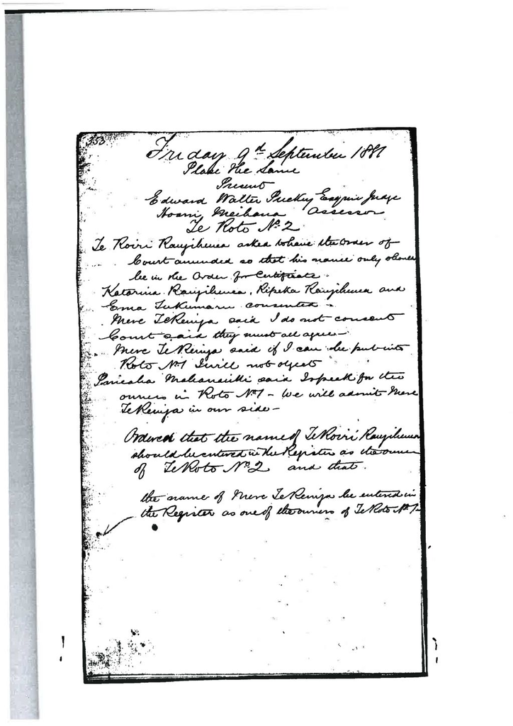 Pineaha Mahauariki said – I speak for the owners in Roto No. 7. We will admit Mere Te Reinga in our side.