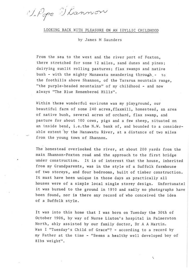 Page Text 1 From the sea to the west and the river port of Foxton, there stretched for some 12 miles, sand dunes and pines; dairying sunlit rolling pastures; flax swamps and native bush - with the mighty Manawatu meandering through,- to the foothills above Shannon, of the Tararua mountain range, "the purple-headed mountains" of my childhood - and now always "The Blue Remembered Hills".