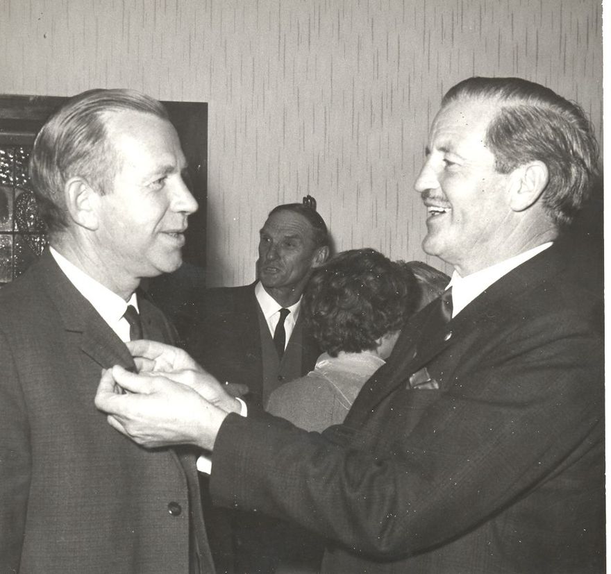 Mr Ian Hulton (left), camp chief at Scout Training H.Q., Tatum Park, receiving a Bar to the Medal of Merit, which he was awarded in the Founders Day list in February. Man (right) presenting the Bar, unidentified.