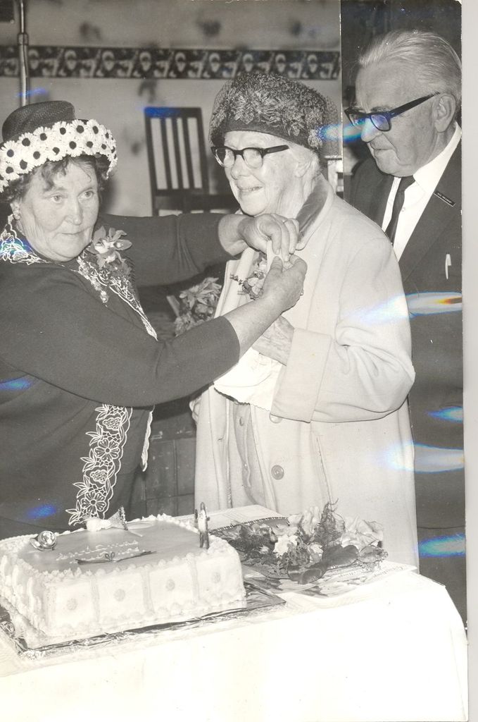 Older woman (left) assists elderly woman (centre) to pin on her floral corsage. Elderly man (right) watches, wearing tag on lapel – vice president.
