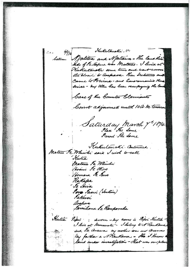 The disputants with me were Kingi, Tuainene, Wanarape and Rangikopuiga. The European I alluded to was with us owing to the hardness of my speech ---- ----- said, “Where is your father’s kainga. I replied you go to Porirua eat pipi’s there. Matangi, an old chief of Ngati Awa, then arose, came forward and said, “Ngati Awa cease talking – leave the matter with me – said to Ngati Awa leave your boundary at Paetawa. Wi Kingi again got up and said Matene you fix the boundary at the sea. I said because Ngati Toa have assembled at Otaki, I will take your word. I am not able to do it alone. We returned to Otaki – found a number of chiefs there - Rauparaha and others.