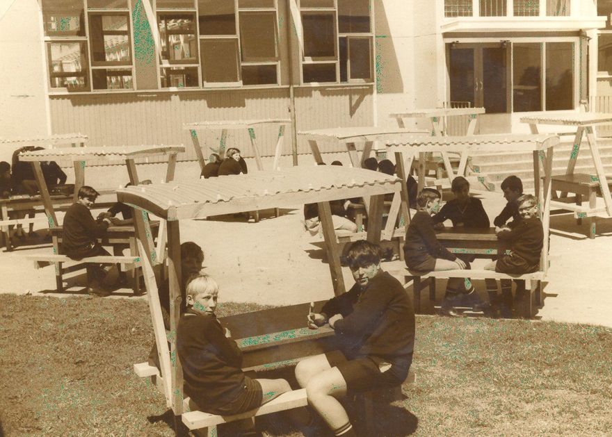 Penciled on back - Horowhenua College pupils with new sheltered tables and seating which members of the College P.T.A. have constructed on a voluntary Basis. Fri. Nov. 14, 1969.