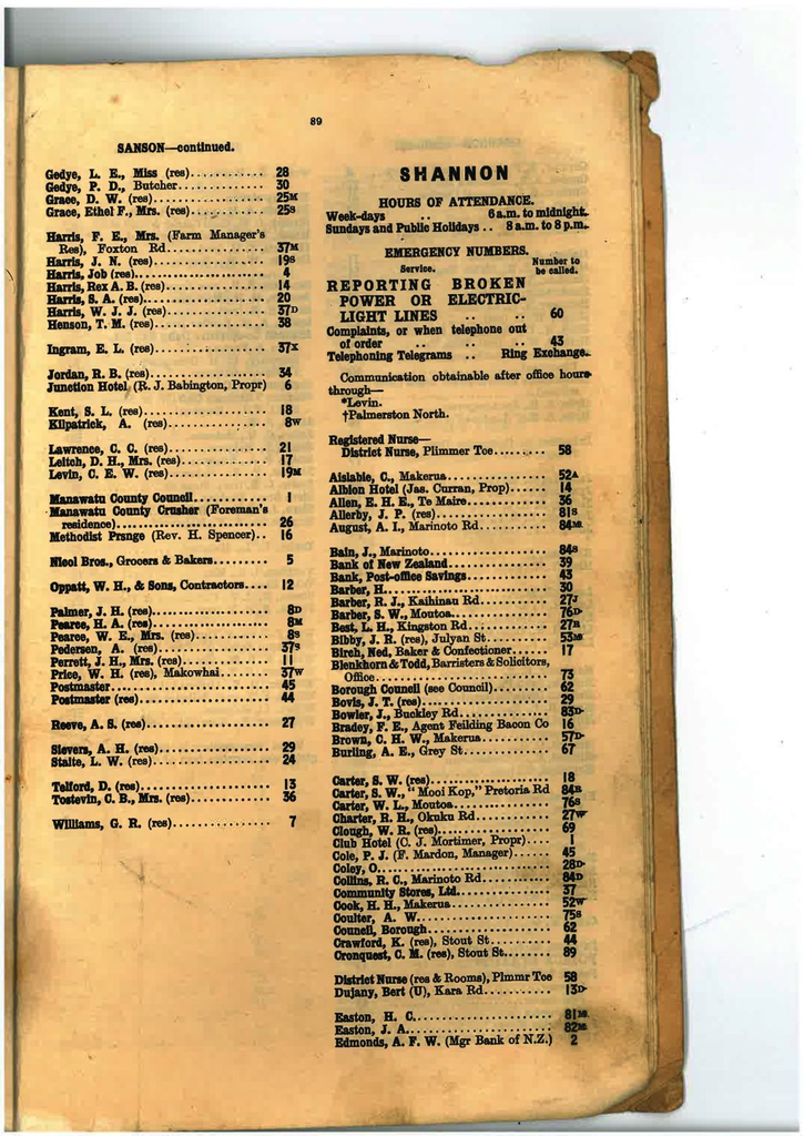 HOURS OF ATTENDANCE. Week-days ..6 a.m. to midnight Sundays and Public Holidays . . 8 a.m. to 8 p.m. EMERGENCY NUMBERS. Complaints, or when telephone out of order 60 Telephoning Telegrams 43 REPORTING BROKEN POWER OR ELECTRIC- 60 LIGHT LINES Communication obtainable after office hours, through- *Levin. *Palmerston North. Registered Nurse— District Nurse, Plimmer Tce 58 Aislabie, C., Makerua 52A Albion Hotel (Jas. Curran, Prop) 14 Allen, E. H. E., To Maire 36 Allerby, J.P. (res) 81S August, A. I., Marinoto Rd 84M Bain, J., Marinoto 84S Bank of New Zealand 39 Bank, Post-office Savings 43 Barber, H 30 Barber, R. J., Kaihinau Rd 27J Barber, S. W., Moutoa. 76D Best, L. H., Kingston Rd 27R Bibby, J. R. (res), Julyan St 53M Birch, Ned, Baker & Confectioner 17 Blenkhorn & Todd,Barristers &Solicitors, Office 73 Borough Council (see Council) 62 Bovis, J. T. (res). 29 Bowler, J., Buckley Rd 83D Bradey, F. E., Agent Feilding Bacon Co 16 Brown C. H. W., Makerua 57D Burling., A. E., Grey St 67 Carter, S. W. (res). 18 Carter, S. W., " Mooi Kop," Pretoria Rd 84R Carter, W. L., Moutoa 76S Charter, R H., Okuku Rd 27W Clough, W. R. (res) 69 Club Hotel (C. J. Mortimer, Propr) 1 Cole, P. J. (F. Mardon, Manager) 69 Coley, O 28D Collins, R. C., Marinoto Rd 84D Community Stores, Ltd. 37 Cook, H. H., Makerua 52W Coulter, A. W. 75S Council, Borough 62 Crawford, K. (res), Stout St 44 Cronquest, C. M. (res), Stout St. 89 District Nurse (res & Rooms), Plmmr Tce 58 Dujany, Bert (U), Kara Rd 13D Easton, H. C 81M Easton, J A 82M Edmonds, A. F. W. (Mgr Bank of N.Z) 2