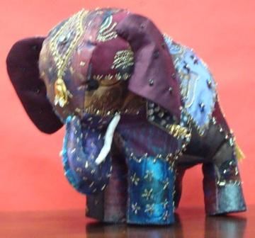 Beaded and embroidered elephant made with silk fabric.