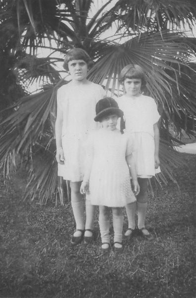 Joyce Palmer, Joyce Sutton and Hope Skinner, three little girls standing under a palm tree.