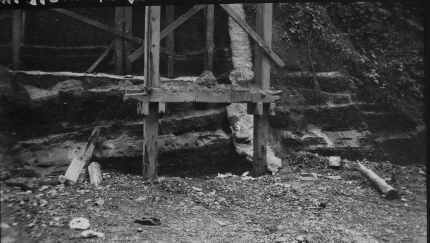 “Hobson St. Gully, 16/4/53” is the inscription on the reverse of this photograph which shows timber framing and several layers of strata.
