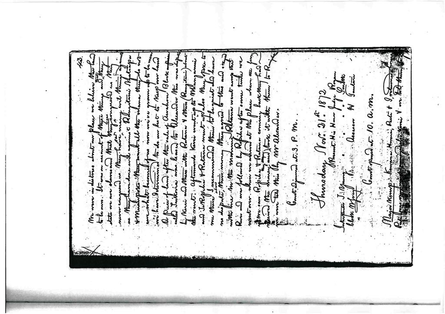 Governor Bowen spoke to us. He said he had been looking for some way to soften down this dispute and put a stop to our intentions. If you like (he said) two natives could be appointed on each side to enquire into the case. I said I would not agree to this. I told him it would not be right as all information about conquests was given at Rangitikei. What relates to this case is that which relates to our ancestors. He then said that failing that he would send a lawyer and we could make the statements to him. After that we went home to the Native Hostelry.