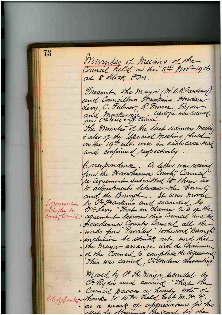 Correspondence: A letter was received from the Horowhenua County Council, re Agreement submitted to them as to adjustments between the County and the Borough. It was moved by Cr. Hankins and seconded by Cr. Levy “That in clause 2B of the Agreement between this Council and the Horowhenua County Council all the words from “Provided “ to the word “Borough” inclusive be struck out and that the Mayor arrange with the Chairman of the Council to complete the Agreement.