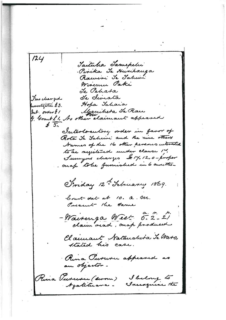 I belong to Tuhourangi. This land belonged to Raharuhi, he purchased it when he went north. I went with him. Rahahuri left the land in my charge – ehara i te mea moku ake.