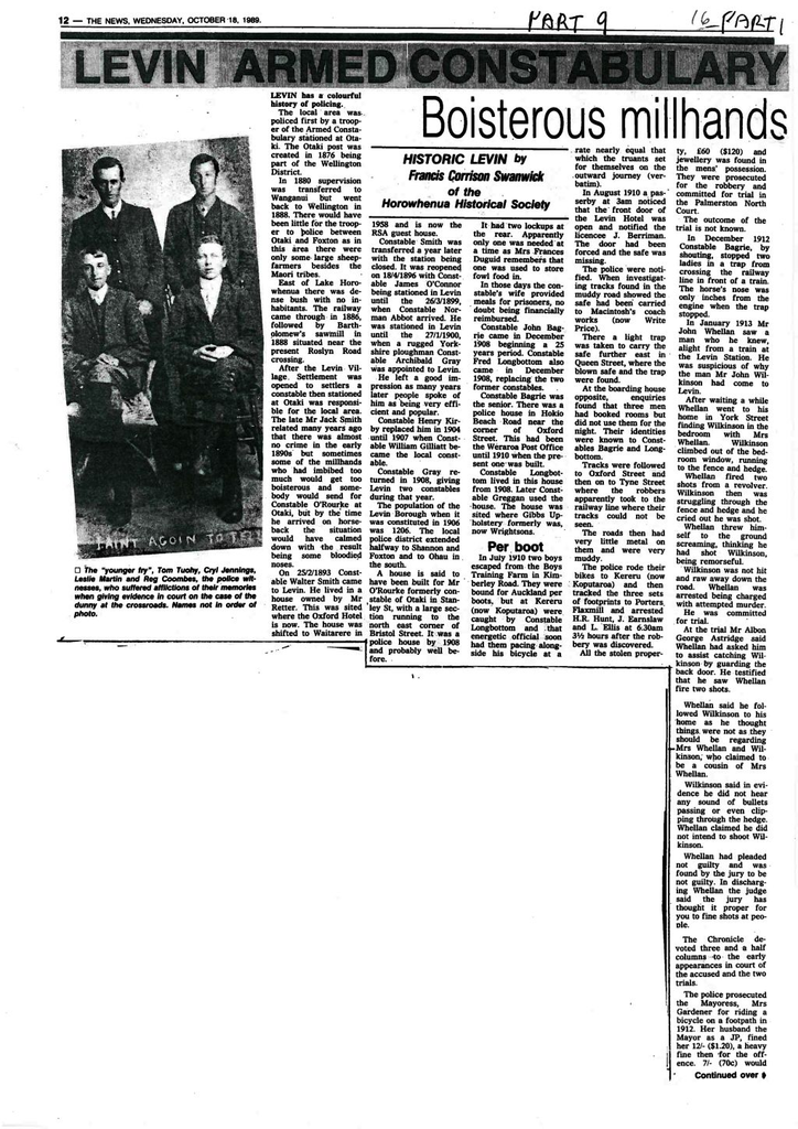 After the Levin Village Settlement was opened to settlers a constable then stationed at Otaki was responsible for the local area. The late Mr Jack Smith related many years ago that there was almost no crime in the early 1890s, but sometimes some of the mill hands who had imbibed too much would get too boisterous, and somebody would send for Constable O’Rourke at Otaki, but by the time he arrived on horseback the situation would have calmed down with the result being some bloodied noses.