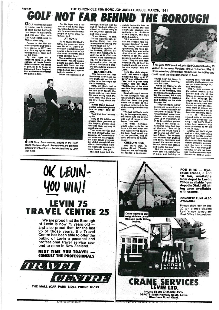 Levin Golf Club.The year 1977 saw the Levin Golf Club celebrating 25 years on its course at Moutere. Mrs Dr Hunter and Mrs N. Hosie were two of the oldest members at the jubilee and could recall the first golf course in Levin.