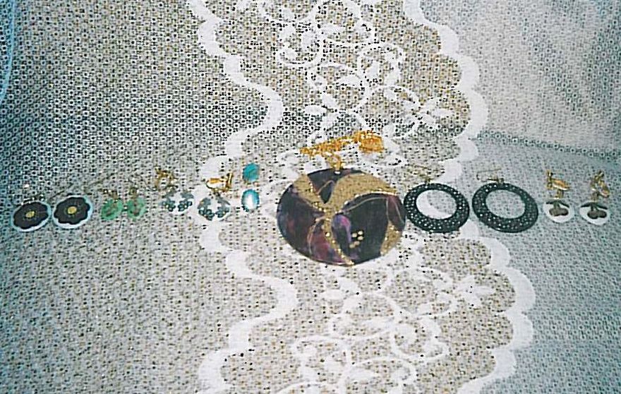 Various earrings and a pendant in purple and pink lustre with gold trim.