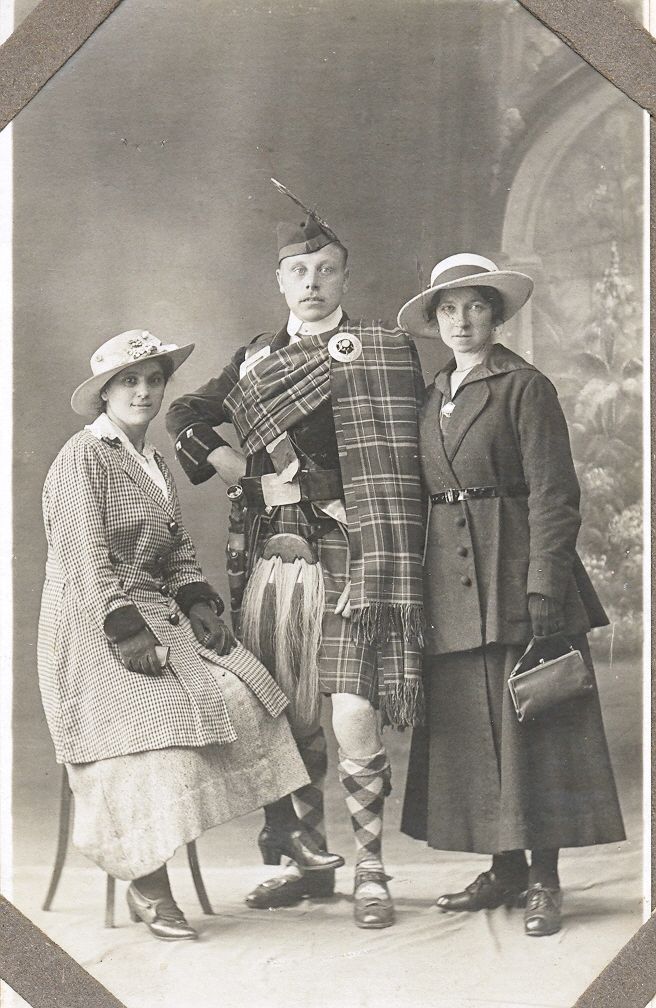 Group of three – two ladies and a man who is dressed in scottish costume, could be a soldier or a dancer.