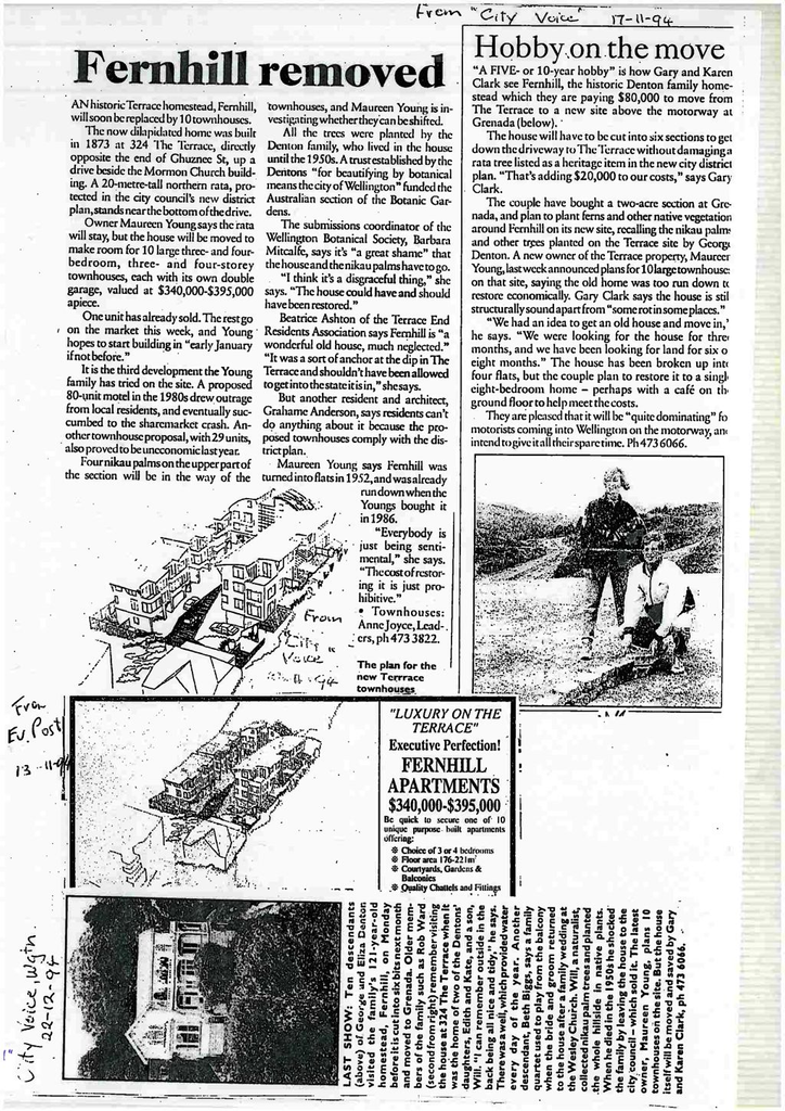 The couple have bought a two-acre section at Grenada, and plan to plant ferns and other native vegetation around Fernhill on its new site, recalling the nikau palms and other trees planted on the Terrace site by George Denton. A new owner of the Terrace property, Maureen Young, last week announced plans for 10 large townhouses on that site, saying the old home was too run down to restore economically. Gary Clark says the house is still structurally sound apart from "some rot in some places."