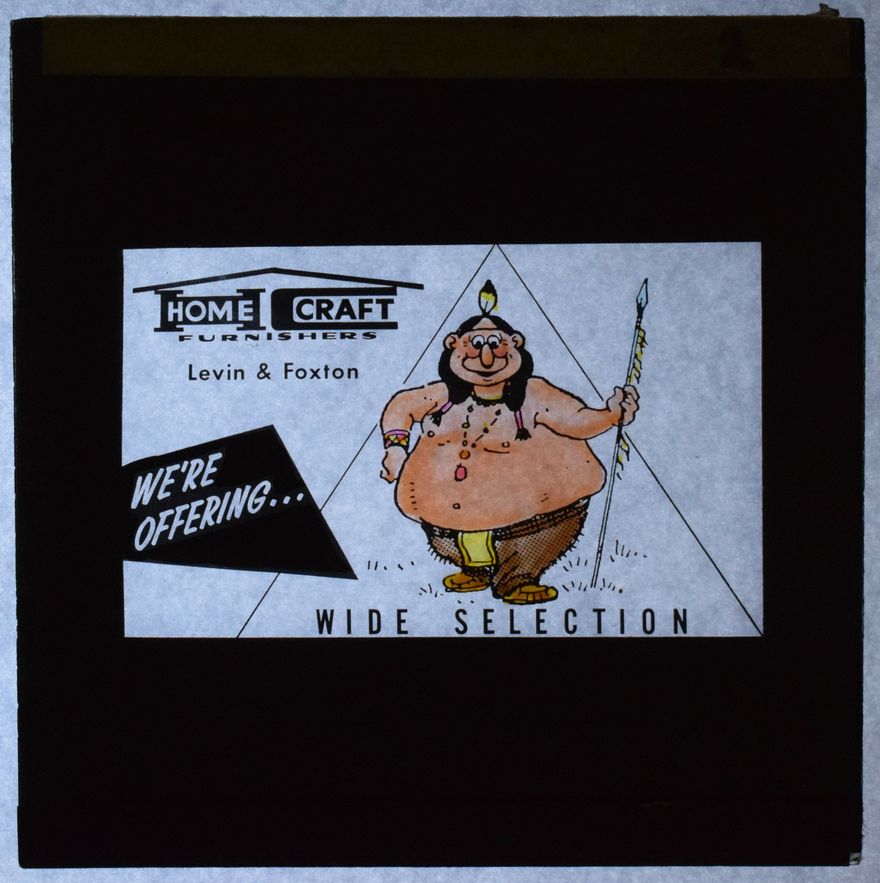 Advertising certainly has changed! Homecraft Furnishers has a range of cinema slides uploaded on Kete and most of them have some rather offensive (and in one case sexist) depictions of Native Americans.