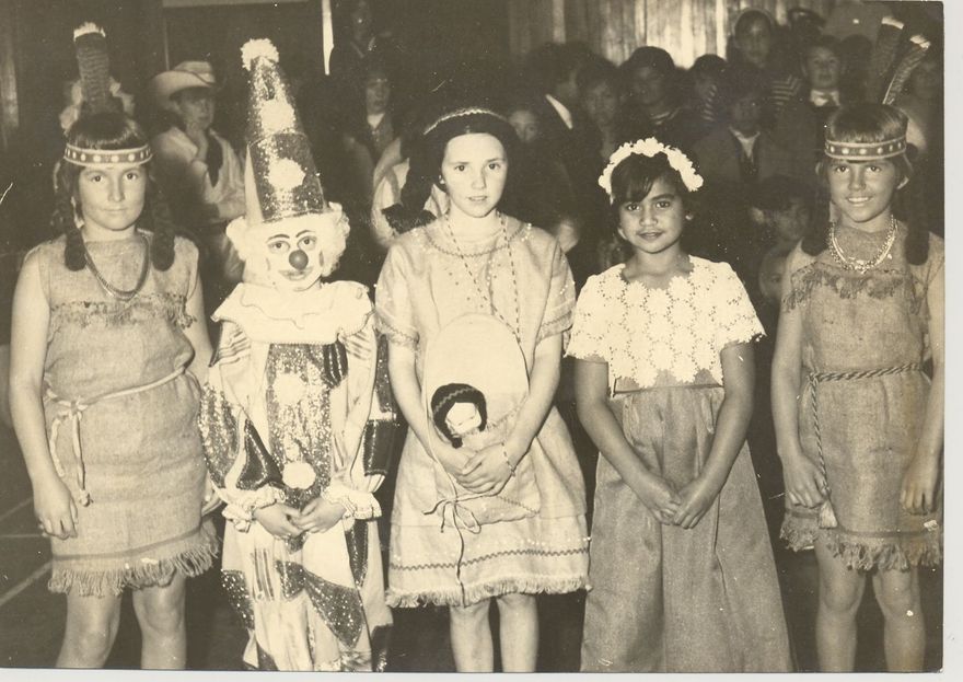 (L to R) – Jill Mansfield (North American Indian Maiden). Lynnette Carthew (Clown). Anne Wardell (North American Indian Maiden). Mary Wehaipeihana (?). Lucy Mansfield (North American Indian Maiden).