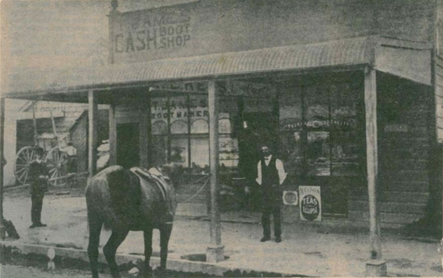 At the time this picture was taken (pre 1912), Thomas James, the bootmaker, occupied the south side of the building and Hock Key, a grocer, the north side, picture pre 1912.