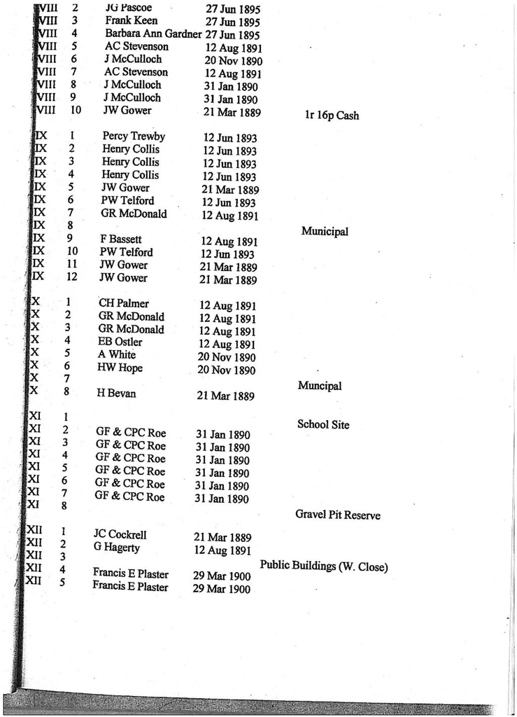 31 Jan 1890 XI 8 Gravel Pit Reserve XII 1 JC Cockrell 21 Mar 1889 XII 2 G Hagerty 12 Aug 1891 XII 3 Public Buildings (W. Close)