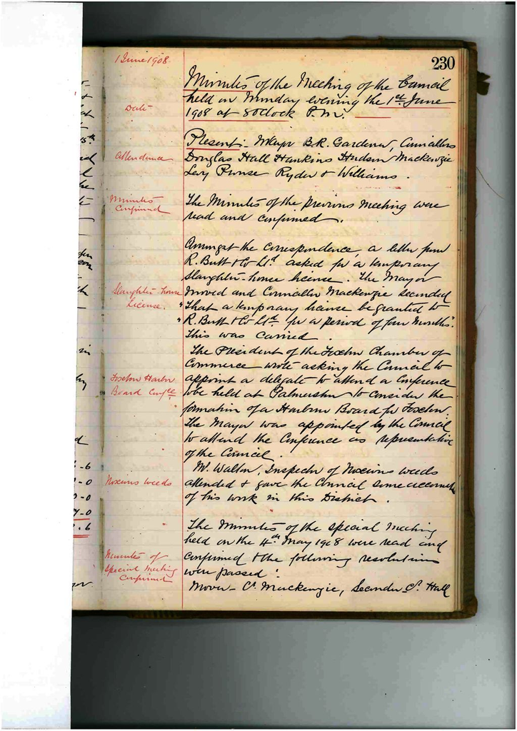 Amongst the correspondence a letter from R. Butt & Co. Ltd asked for a temporary slaughterhouse licence. The Mayor moved and Councillor MacKenzie seconded “that a temporary licence be granted to R. Butt & Co. Ltd for a period of four months”. This was carried.