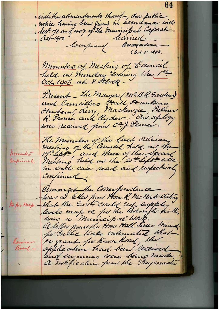 Amongst the correspondence was a letter from Hon. R. McNab stating that the Govt. could not supply levels map etc. for the Borough, as this was a Municipal work.