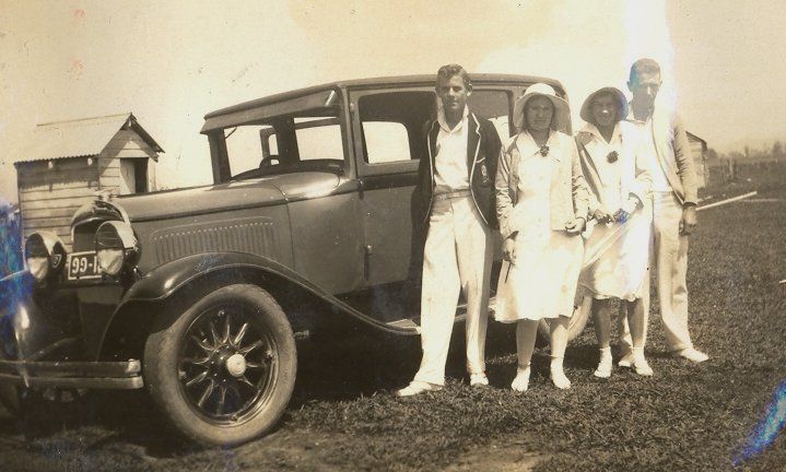 All dressed in white. A group of young people standing beside a car, are they going to play tennis perhaps?