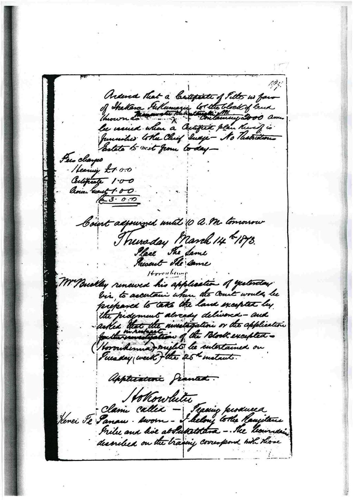 Mr Buckley renewed his application of yesterday viz to ascertain when the court would be prepared to take the land excepted by the judgment already delivered - and asked that the investigation or the application in respect of the Block excepted (Horowhenua) might be entertained on Tuesday (week) the 25th instant