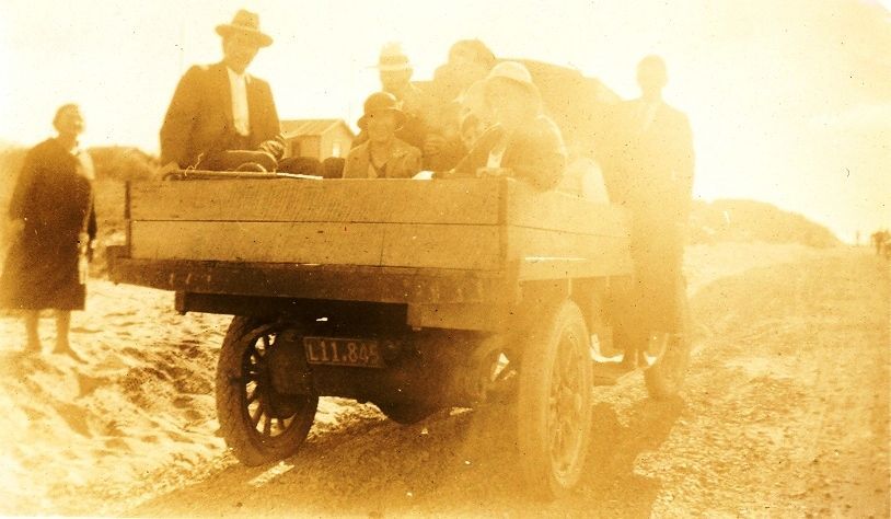 Making for home after a day at the Waitarere beach. Mum standing in the sand and Dad is on the back of the truck with friends. (the photograph is not very clear)