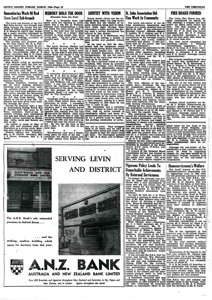 7) Homeservicemen's welfare.The Levin branch of the N.Z. Homeservicemen's Association had its beginnings early in 1944 with the generous assistance of some members of the local R.S.A., notably the late Mr. H. J. Lancaster and Mr. H. G. Mackay, who was secretary of the R.S.A. at that time. The main function of the branch has been to assist the rehabilitation of those men and women who served in the forces on the home front in World War II and also to keep the spirit of fellowship alive on the social side. Through the efforts of the association a number of members have been assisted in different ways.