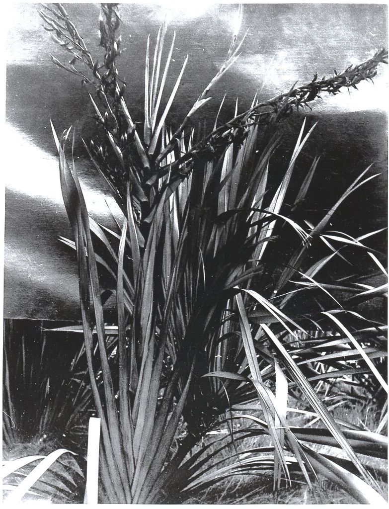 One of 9 photographs of flax (phormium tenax) and other plants taken by Uncle of Mrs M Illes. Flax plant with three seed heads