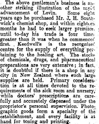 The above gentleman's business is another striking illustration of the rapid advancement of Levin. Some elicit years ago he purchased Mr. J. H. Southwick's chemist shop, and within eighteen months he had to seek larger premises until to-day his trade is four times greater than it was when he commenced first. Keedwell's is the recognised centre for the supply of everything pertaining to the healing art. The stockof chemicals, drugs, and pharmaceutical preparations are very extensive; in fact, it is doubtful if there is a shop in any city in New Zealand where such large supplies are held. Primary consideration is at all times devoted to the requirements of the sick room and nursery; while doctors' prescriptions are carefully and accurately dispensed under the proprietor's personal supervision. Photographic goods form a specialty of the establishment, and every facility is at hand for toning and printing.