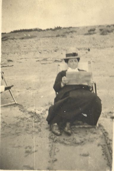 Another Lady reading a book at the beach, she is seated in a deck chair.