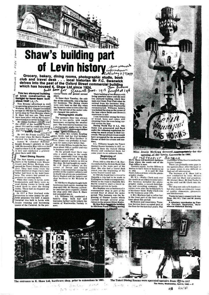 Mr H.C. Gapper recorded on tape in 1963 that he managed the Levin shop for Tom Broome where K. Shaw Ltd now are. This must have been after 1910 as Mr Gapper advertised as a carrier in that year.