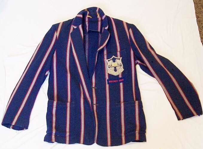 Manawatu College blazer with a “Hockey 1964” felt pocket badge. Pocket has the college crest on it, which says “From each his best”. Coloured dark blue with stripes of light blue framed with fine red stripes.