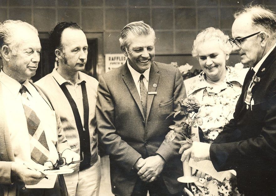 Penciled on back - Enthusiasts at the Horowhenua Rose Society’s annual show. The judge Mr A. Scott, Morrinsville (righ[t]) admires a bloom. from left Messrs C. Holyoake, Waikanae, W.W. Nockels, V. Cave, pres & Miss L. Blackburn. Mon. Nov. 23, 1970.