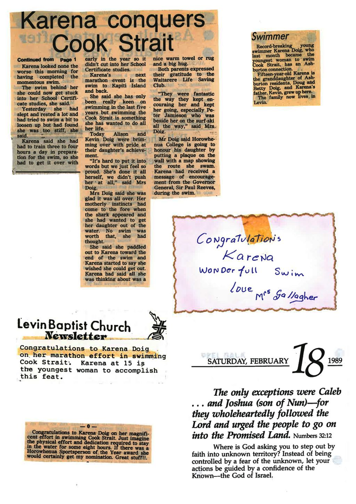 Mr Doig said Horowhenua College is going to honour his daughter by putting a plaque on the wall with a map showing the route she swam. Karena had received a message of encouragement from the Governor General, Sir Paul Reeves, during the swim.