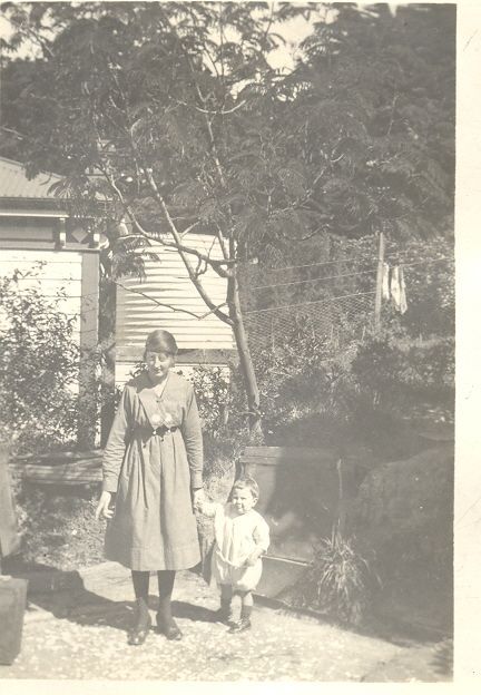 Woman (Mrs Sunley) and child (possibly Shirley Tremewan (nee Sunley) in garden in front of water tank. (Update by Nola Fullarton.)