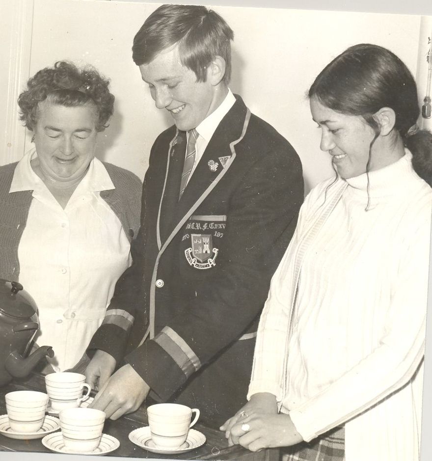 Young man (unidentified) being poured a cup of tea by 2 ladies (unidentified) 1 B&W photo print