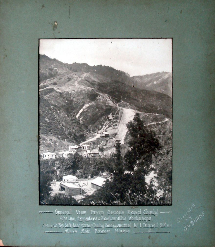 Printed with white paint (?) below photo as caption - General View From Croon’s Road Showing Pipe Line, Carpenters & Blacksmith’s Workshops. (NOTE) In Top Left-hand Corner, Dining Room at Mouth of No.1 Tunnell 900 feet ~~~~ Above Main Power House ~~~~ Presented by J.V. Burns