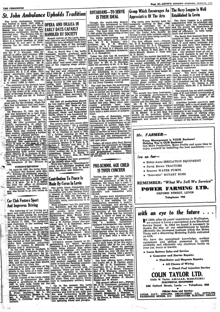 5) Rotarians - to serve is their deal.Though the world -wide Rotary movement was introduced to New Zealand in 1921, nearly a quarter of a century elapsed before it came to Levin. The local club was formed in 1945 under the sponsorship of the Palmerston North club.
