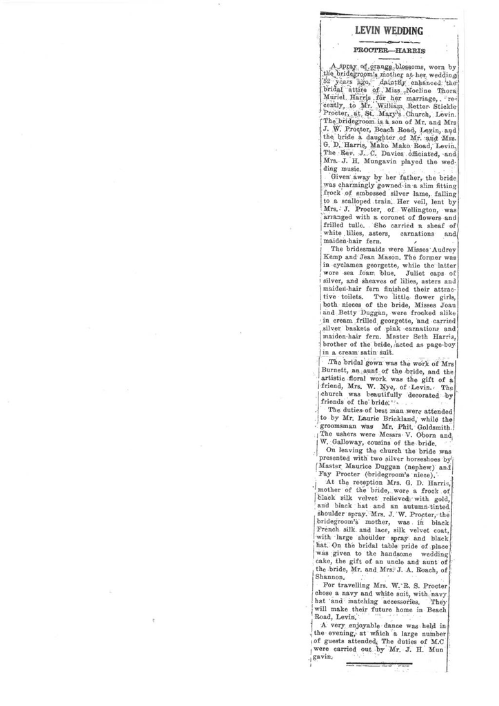A spray of orange blossoms, worn by the bridegroom's mother at her wedding 52 years ago, daintitly enhanced the bridal attire of Miss Noeline Thora Muriel Harris for her marriage, recently, to Mr. William Retter Stickle, Procter at St. Mary's Church, Levin. The bridegroom is a son of Mr. and Mrs J, W. Procter, Beach Road, Levin, and the bride a daughter of Mr. and Mrs. G. D. Harris, Mako Mako Road, Levin. The Rev. J. C. Davies officiated, and Mrs. J. H. Mungavin played the wedding music.