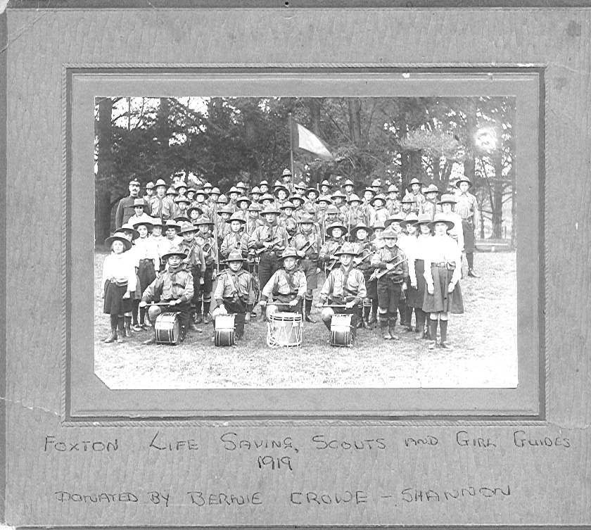 Foxton Life Saving, Boy Scouts and Girl Guides 1919. In the centre of the hpoto is a group of drummers made up of young boys.