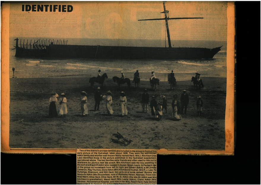 They were the well-known Adkin family and another well-known family named Herd. Mrs J. Aitchison (nee Law) identified those in the picture published in the Hydrabad supplement, produced above. The two families were friends and often used to ride out to Waitarere for picnics near the wreck. Mrs Aitchison said the boy paddling in the surf at left is CIiffAdkin who resides in Queen Street, Levin. In the back row of the group on horseback from left to right are -Gilbert Adkin, a Mr Jimmy Cameron, Reg Thurlow, Dora Adkin (Mrs Aitchison's mother, Mrs R. J. Law, Te Rohenga, Shannon), and Will Herd, two girls on a horse named 'Bonnie' are Marjorie Adkin (Mrs Broomfield, now of Wellesley Haven, Naenae). Front row: Miss Nairn, Alice Herd, Olive Herd, Mr W. G. Adkin (the late Mr Adkin was Mrs Aitchison's grandfather), Maud Herd (Mrs Leslie Adkin), Claire Adkin (Mrs Gardner, Horowhenua Hospital, and now in her 80s), Ralph Herd, Kate Denton (aunt of Mr R. B. Denton), Viv Adkin (New Plymouth) and boy with hand to hat,) John Herd, Mrs Herd senior and Mr Herd senior and small boy Hugh Herd. Mr Gilbert Adkin the man on horseback at left was killed in World War I. The picture was taken by the late Mr G. Leslie Adkin.