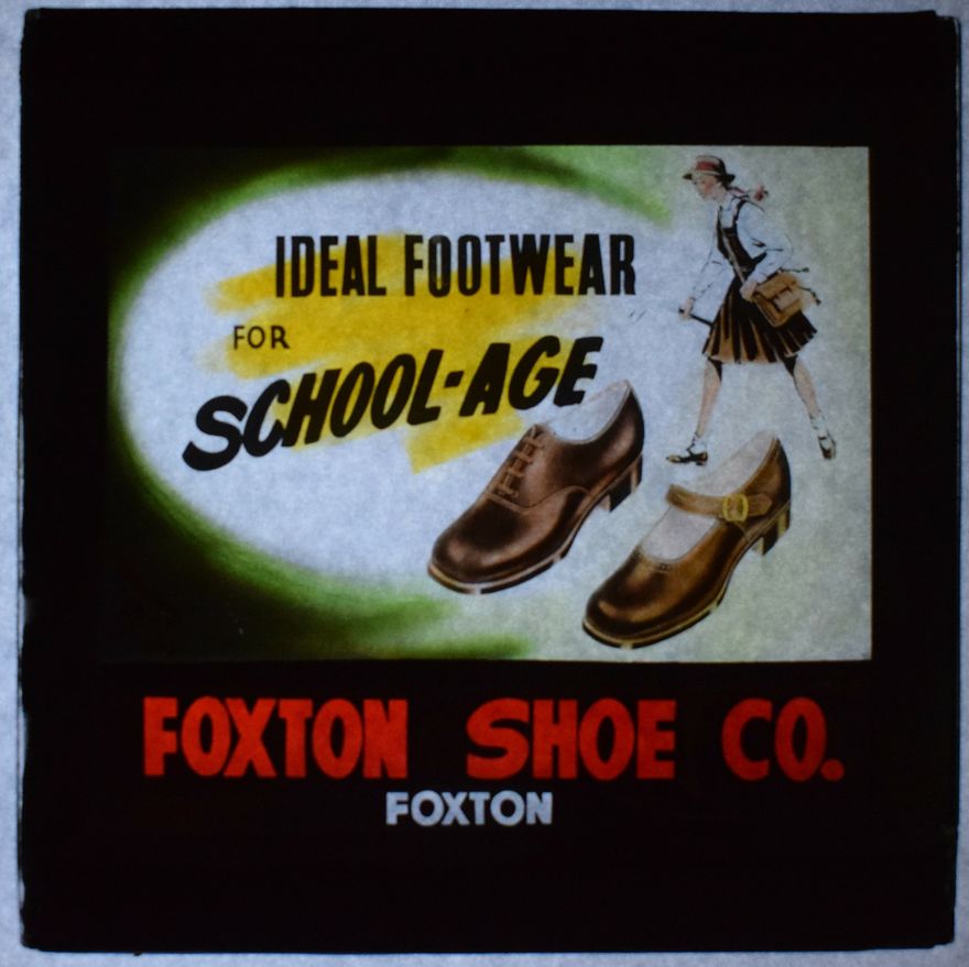For those who think 'back to school sales' are a recent development this slide proves otherwise! The school uniform dates this ad to the 1950s (as does the satchel- no 'school bags' here...). Up until 1952 the Foxton District High School was located near the end of Main Street next to Ihakara Gardens. These buildings were still used for some secondary and primary classes for the rest of the decade.
