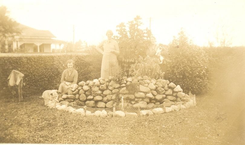 Mum, Mrs Plaster, and Madge at home in the garden standing behind the Rock garden. Note the cat being held by one of the ladies.