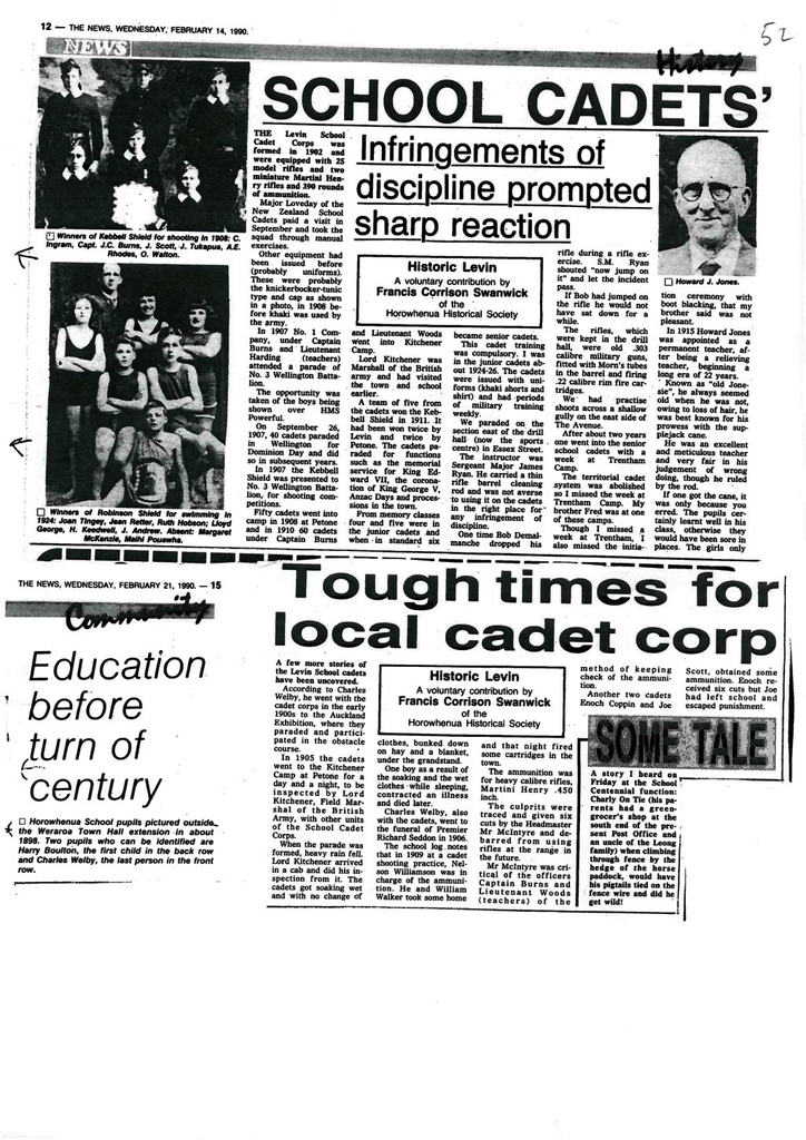 A team of five from the cadets won the Kebbell Shield in 1911. It had been won twice by Levin and twice by Petone. The cadets paraded for functions such as the memorial service for King Edward VII, the coronation of King George V, Anzac Days and processions in the town.