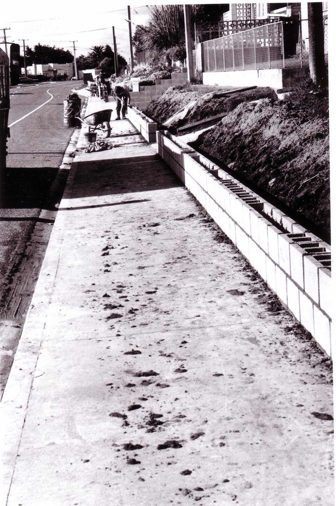 Seabury Avenue reconstruction. Erection of a concrete block retaining wall along the new footpath.